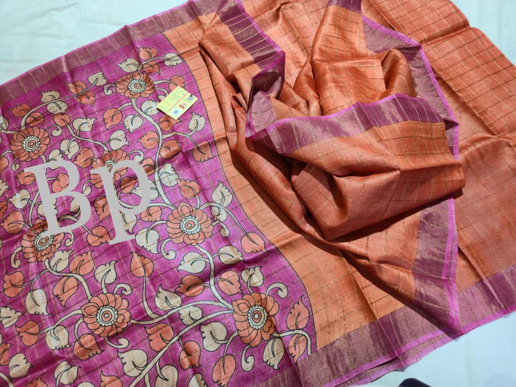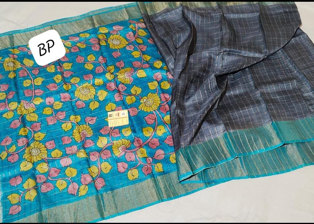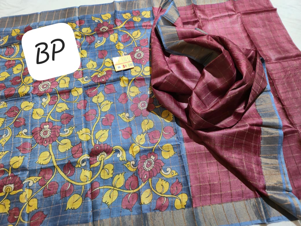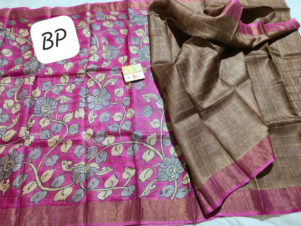 Exclusive collection of Bishnupuri Check Zari Tussar Dye Worked with Hand-Kalamkari Blouse Piece