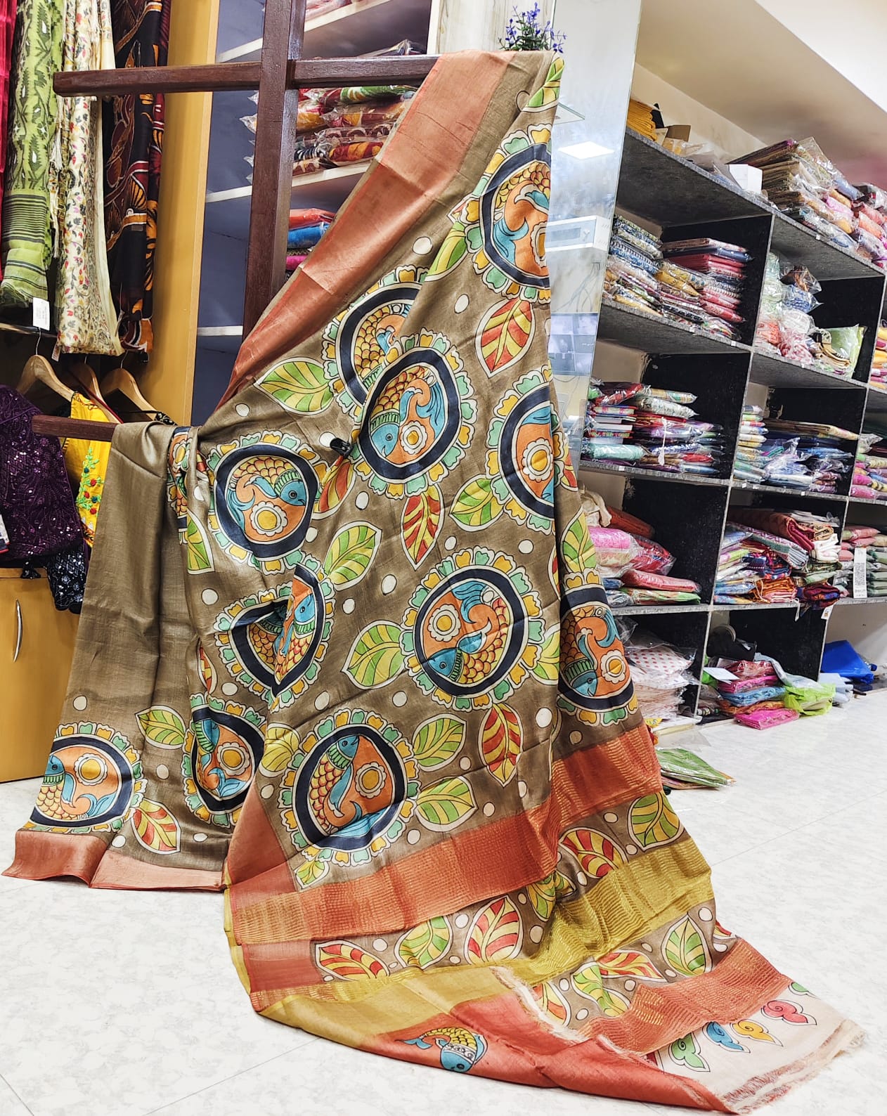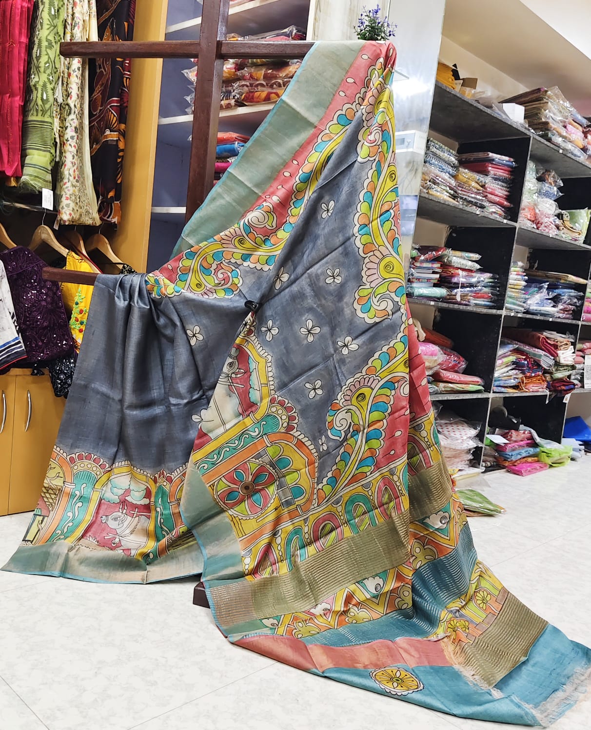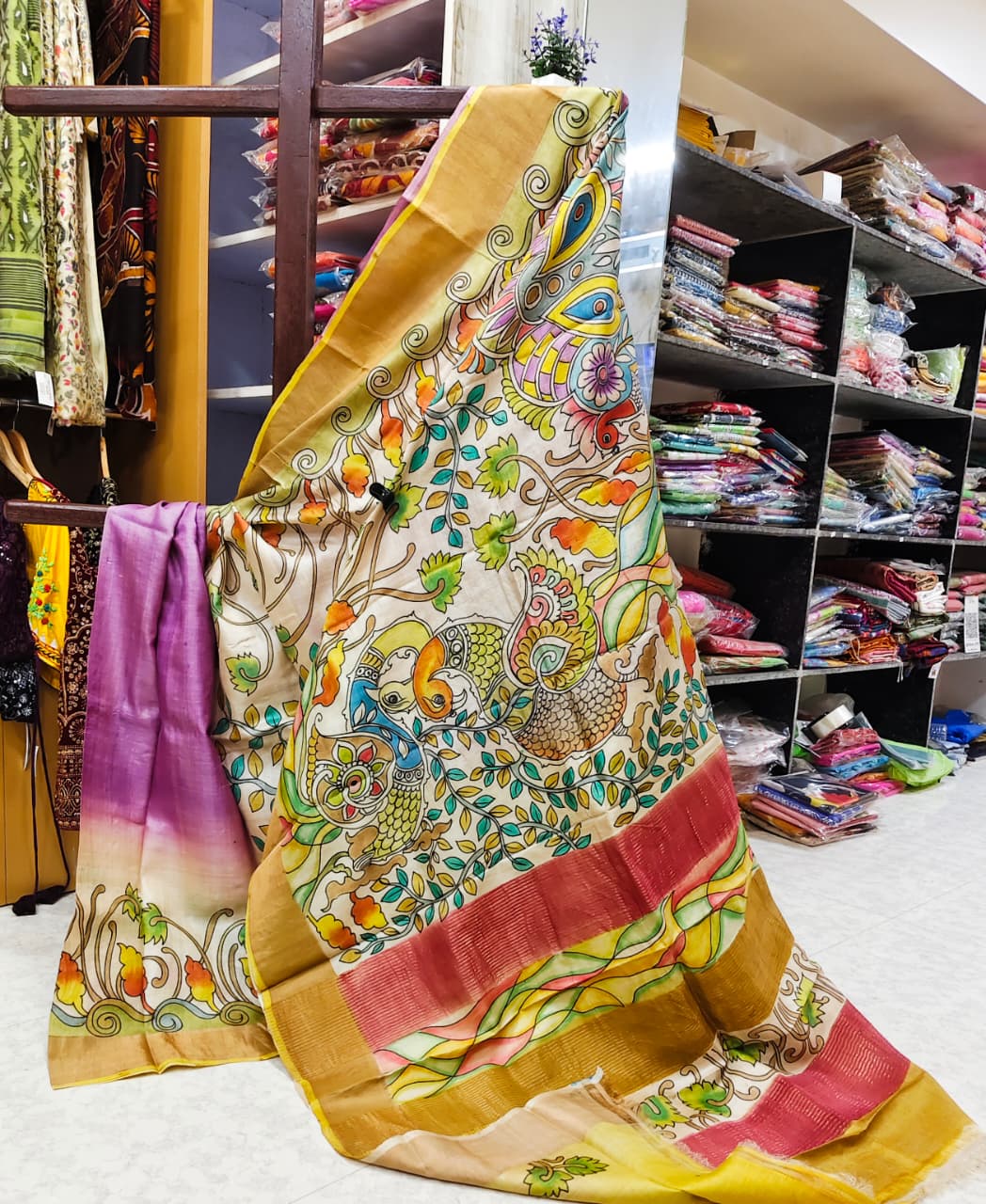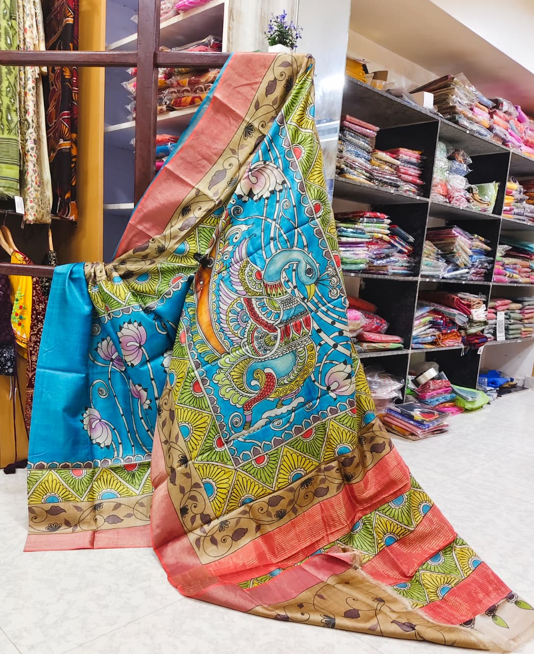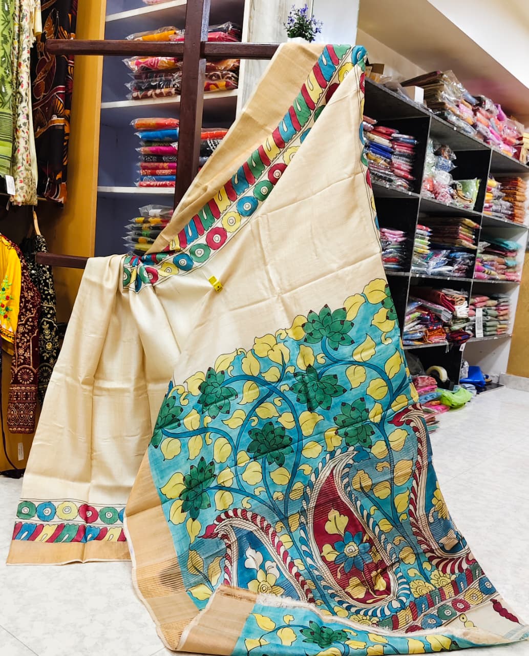 MOST EXCLUSIVE HAND PAINT KALAMKARI DESIGN ON ZARI BORDER BISHNUPURI TASSOR SAREE WITH BLOUSE