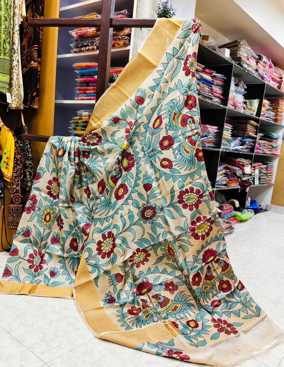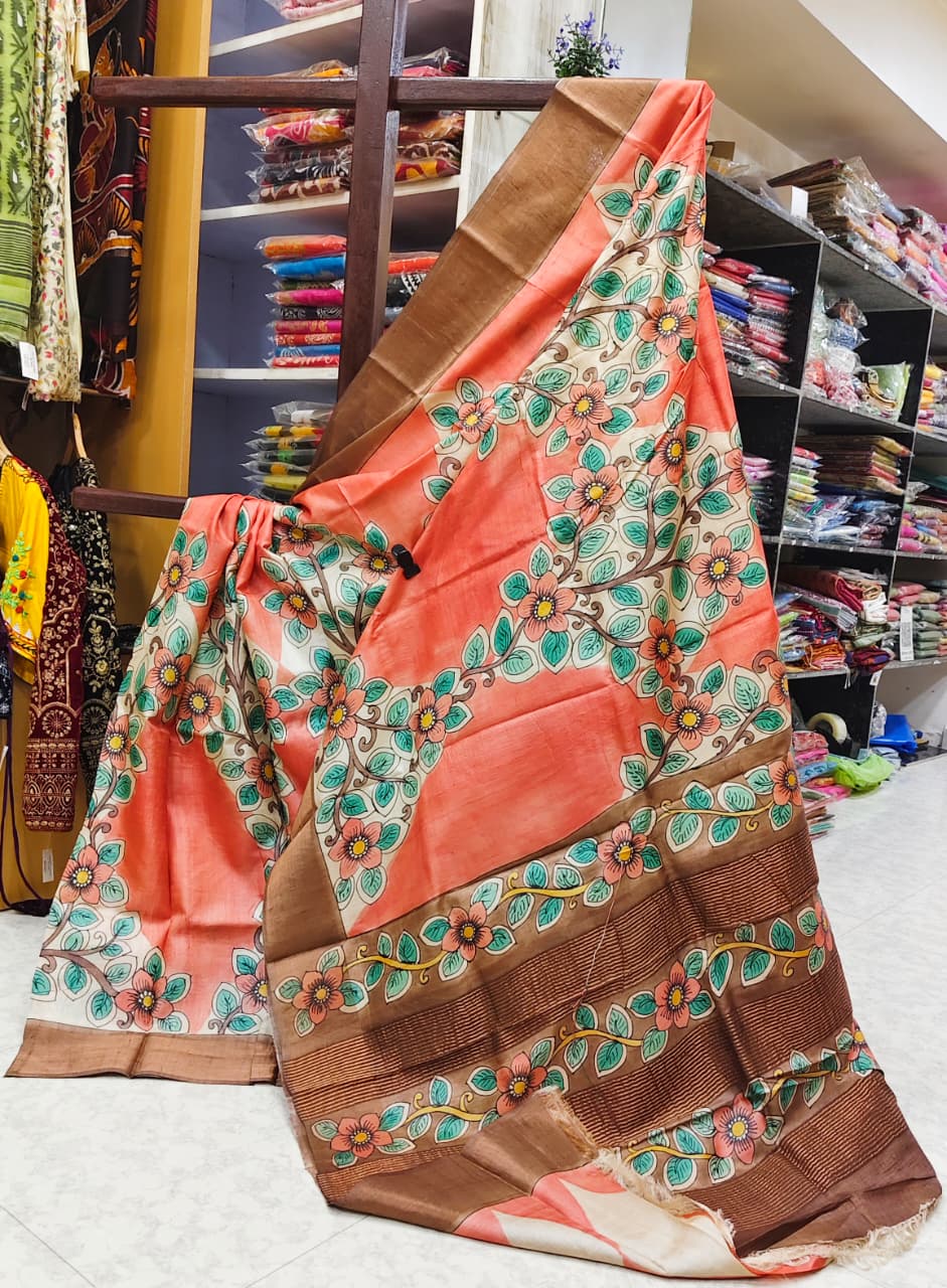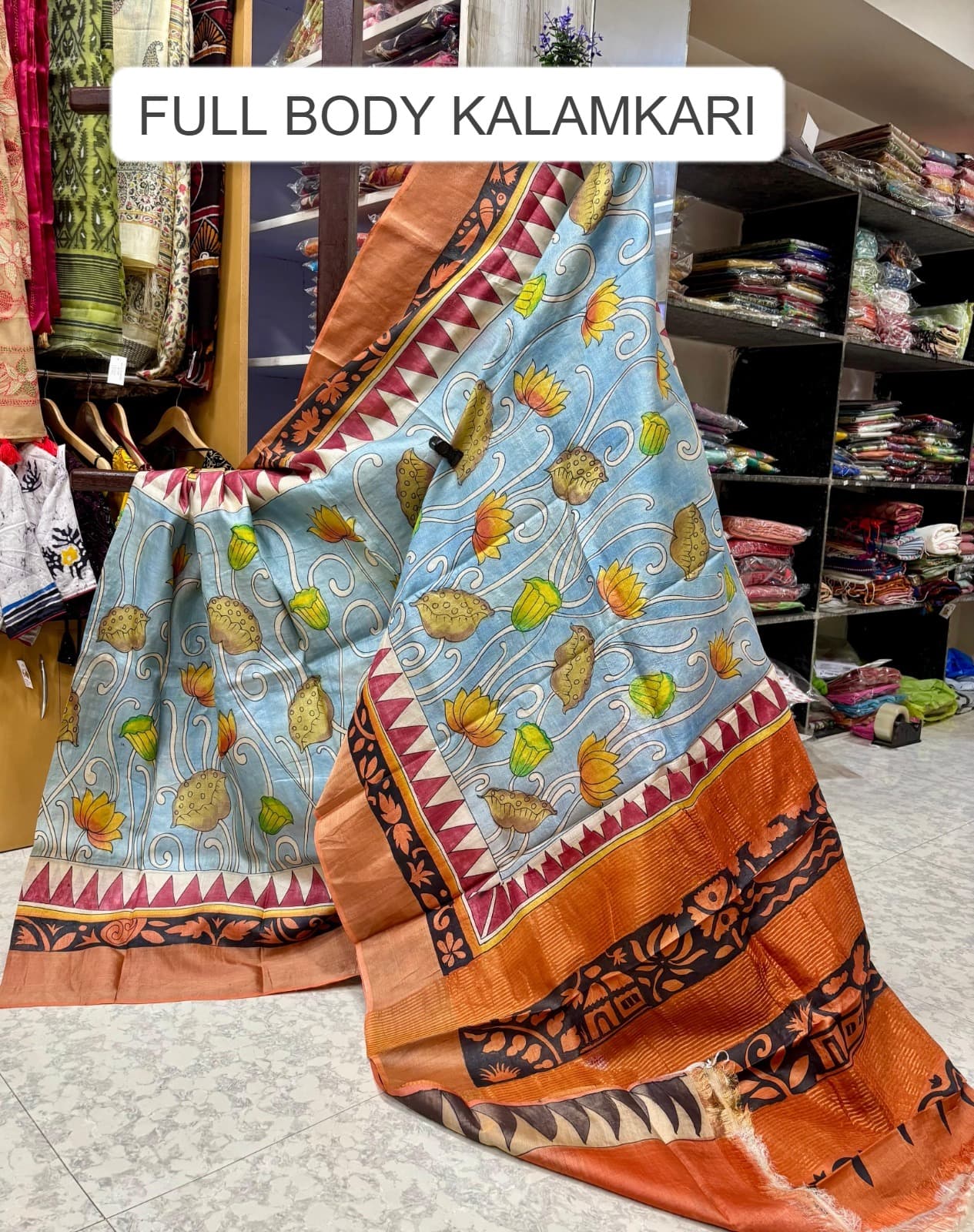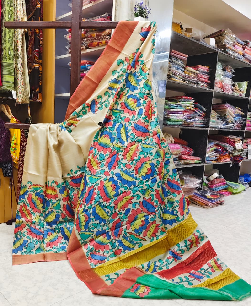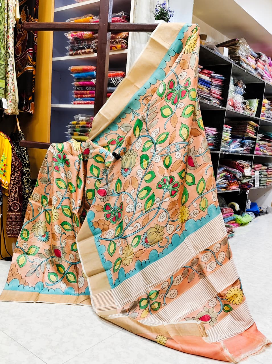 MOST EXCLUSIVE HAND PAINT KALAMKARI DESIGN ON ZARI BORDER BISHNUPURI TASSOR SAREE WITH BLOUSE