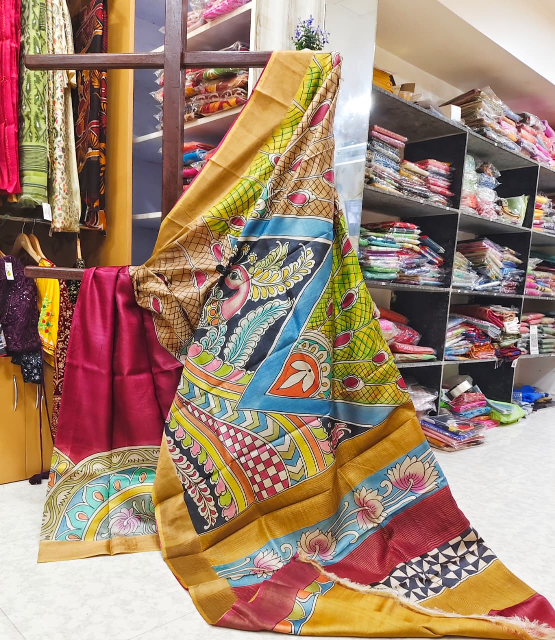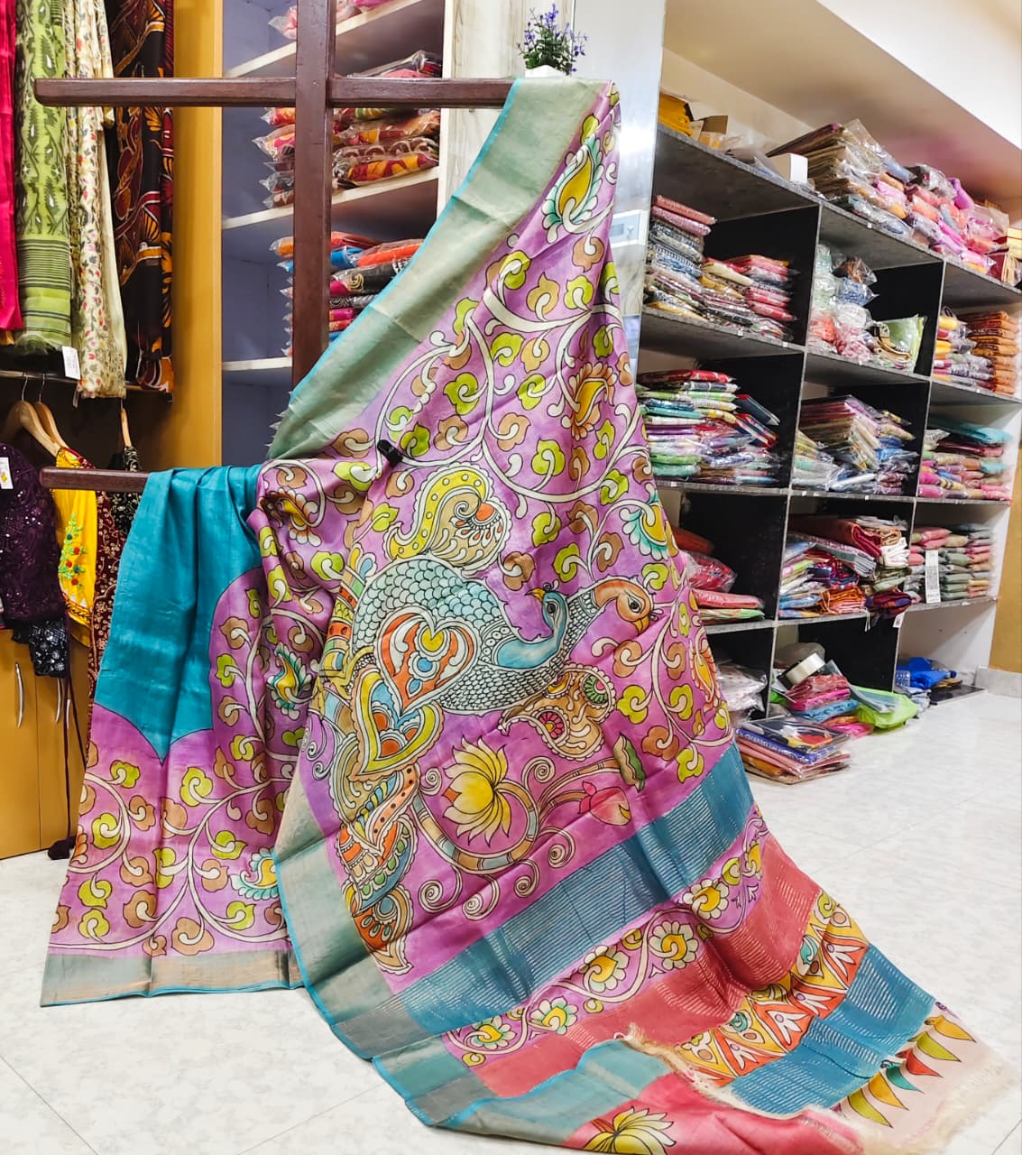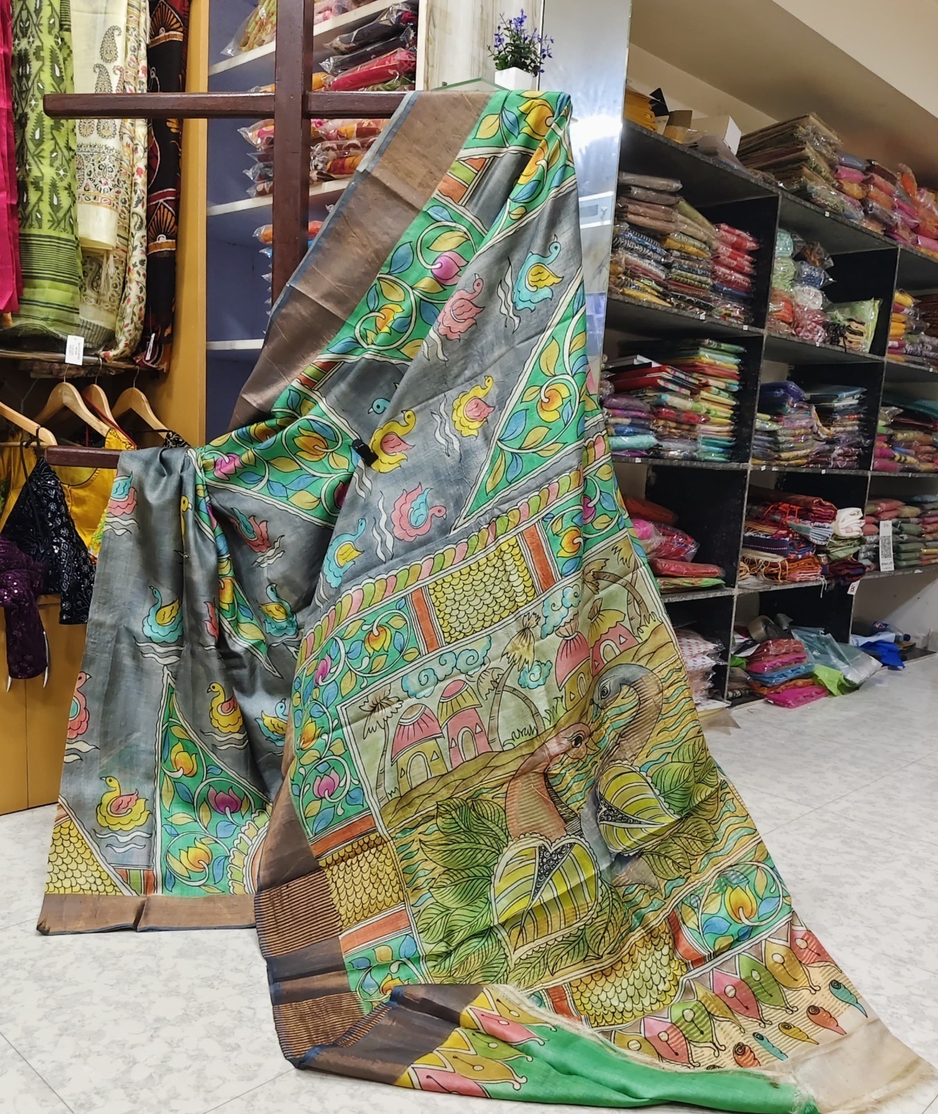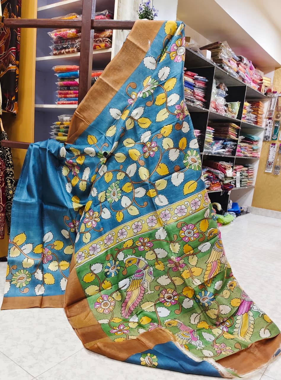 MOST EXCLUSIVE HAND PAINT KALAMKARI DESIGN ON ZARI BORDER BISHNUPURI TASSOR SAREE WITH BLOUSE