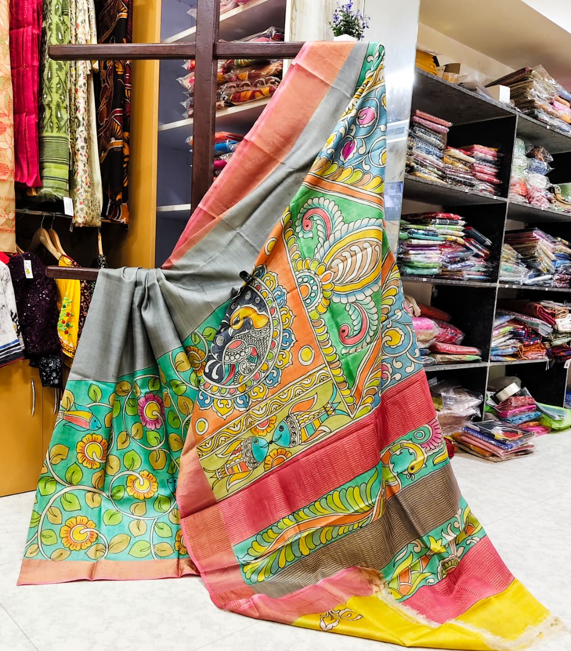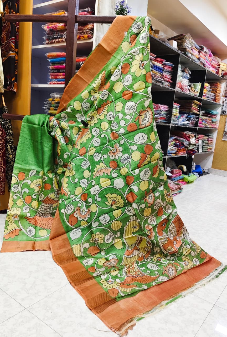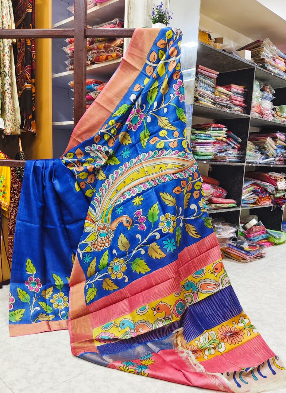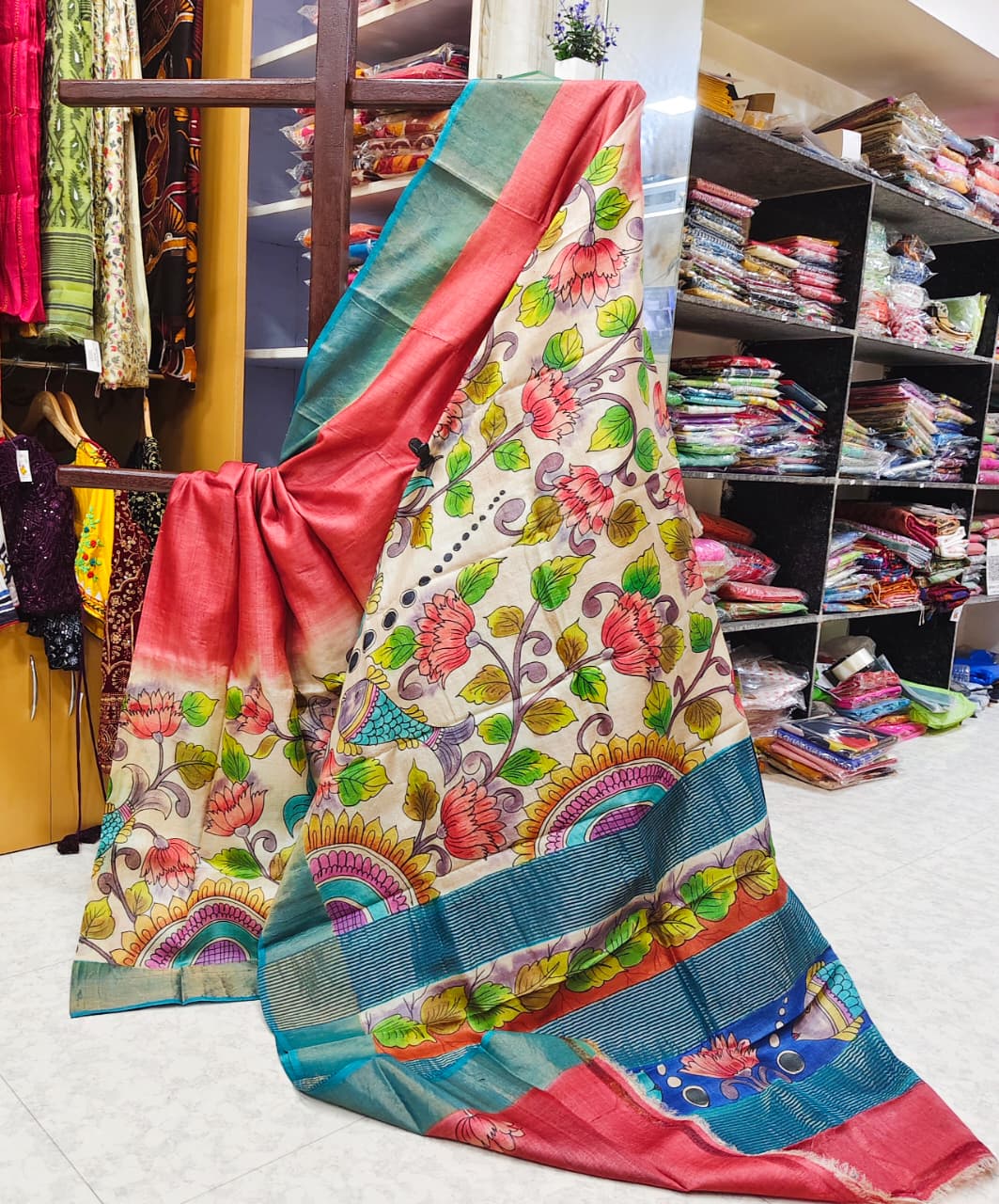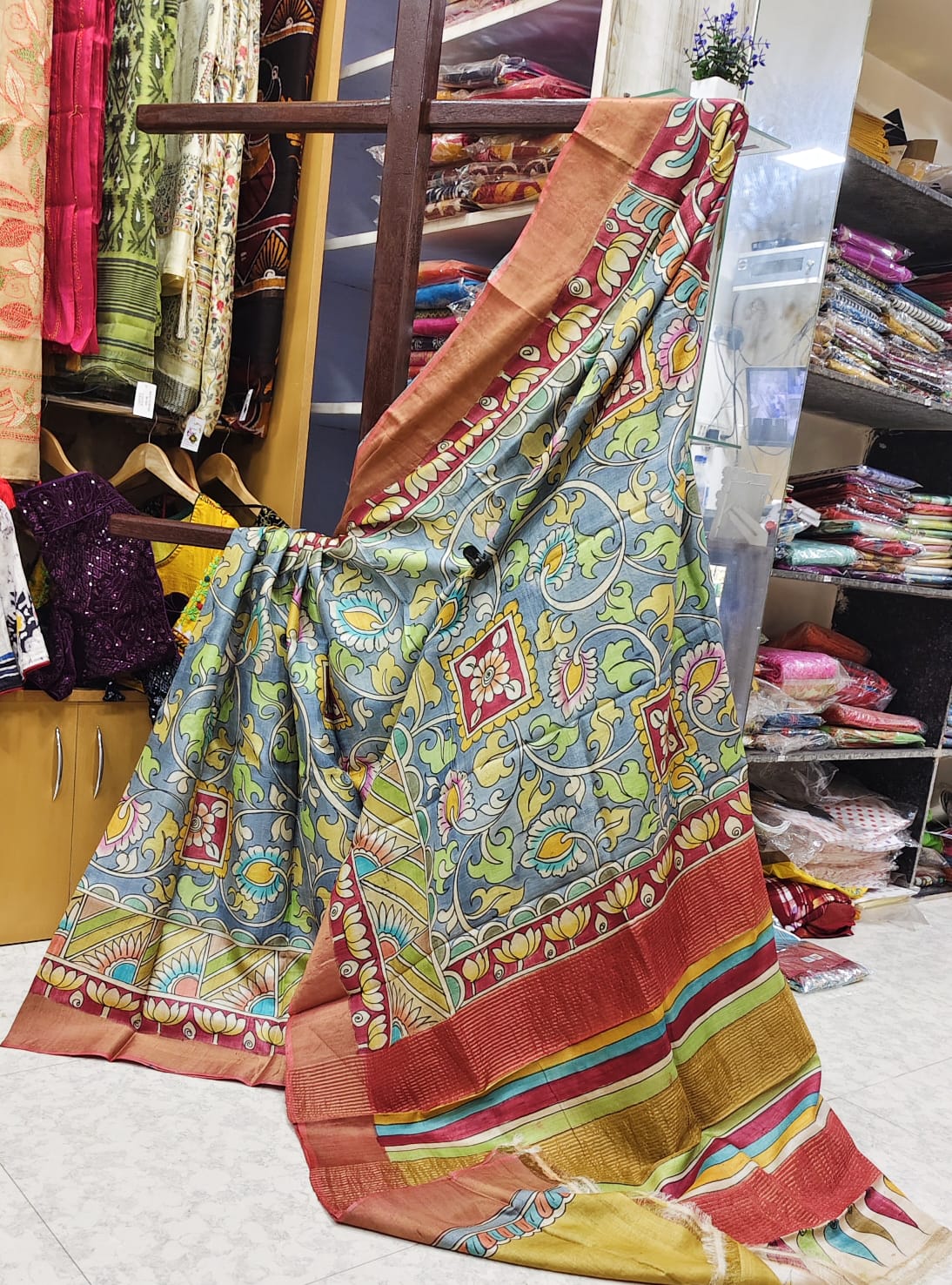 MOST EXCLUSIVE HAND PAINT KALAMKARI DESIGN ON ZARI BORDER BISHNUPURI TASSOR SAREE WITH BLOUSE