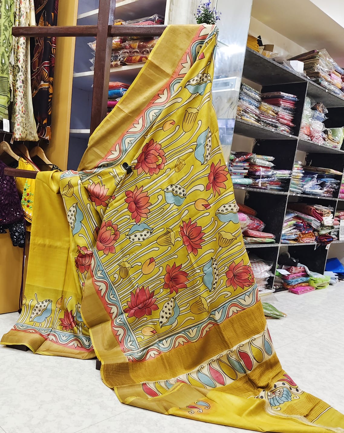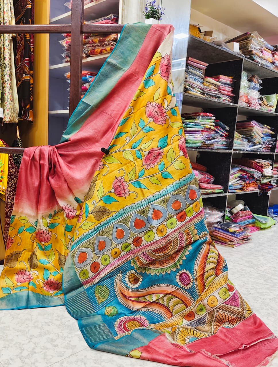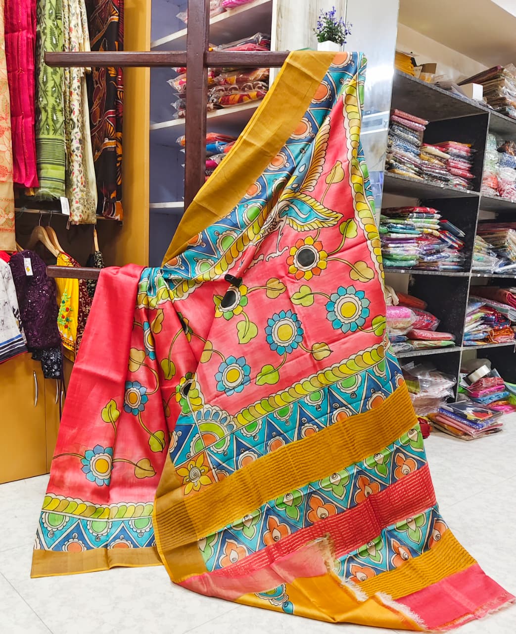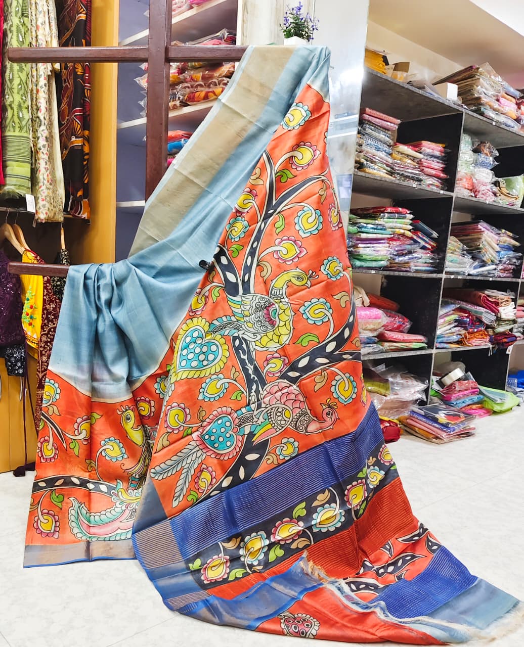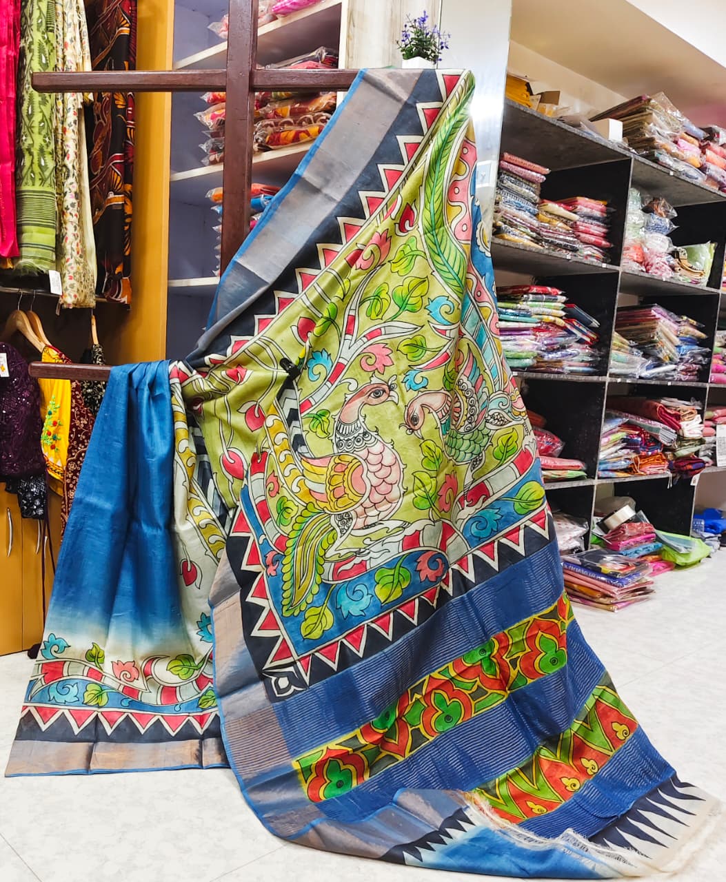 MOST EXCLUSIVE HAND PAINT KALAMKARI DESIGN ON ZARI BORDER BISHNUPURI TASSOR SAREE WITH BLOUSE